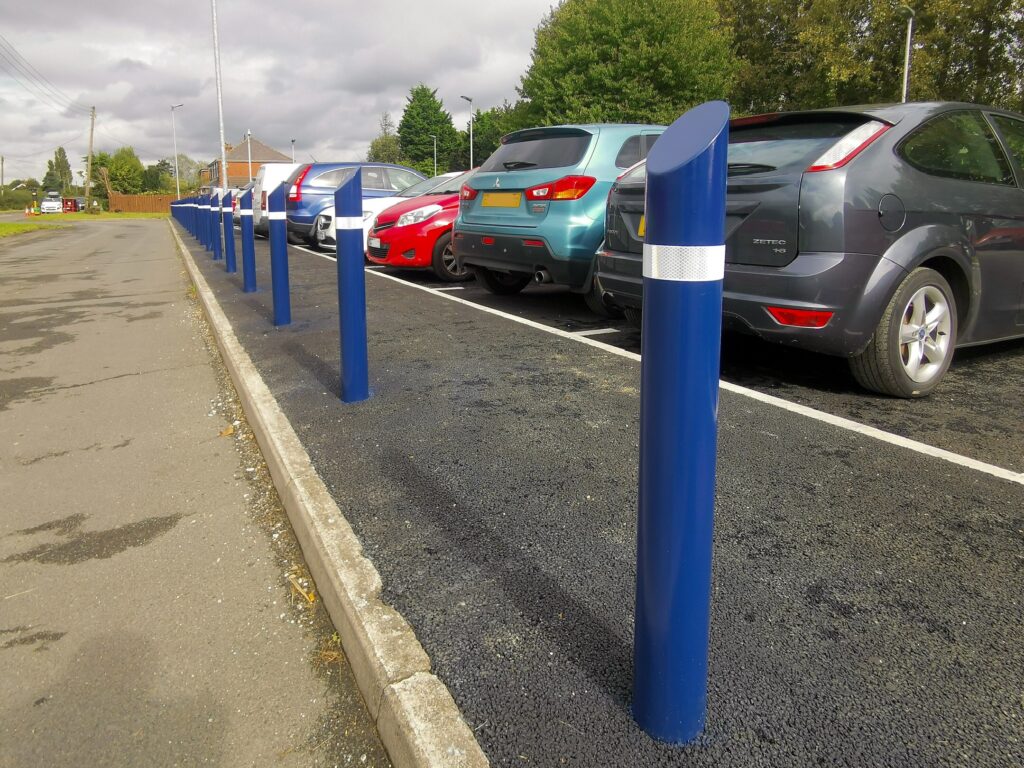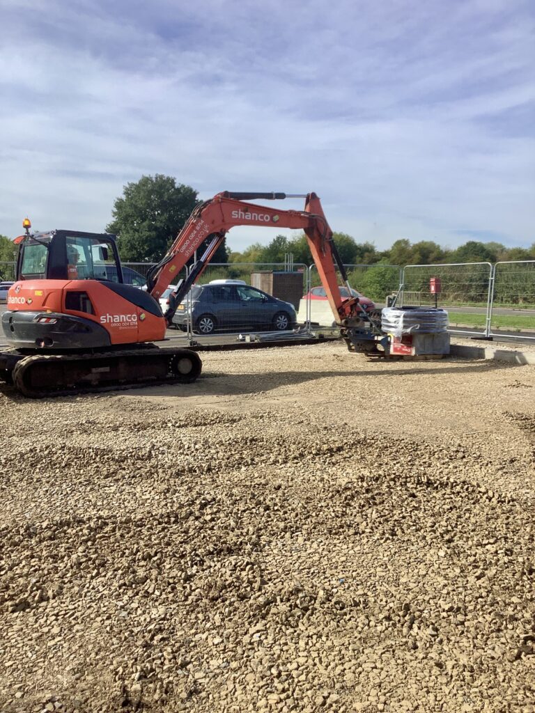 The next stage of the project included excavating and installing new street light ducting as well as casting in-situ concrete duct chambers. Our operatives followed the correct procedures to expose existing services before the ducts were carefully dug up by hand to an existing substation which had numerous high voltage cables supplying the facility. At this stage, the EV charging bases were also installed. The permeable tarmac finish on the car park was then white-lined, and for the purpose of safety, crash barriers were installed, all under Shanco’s control.