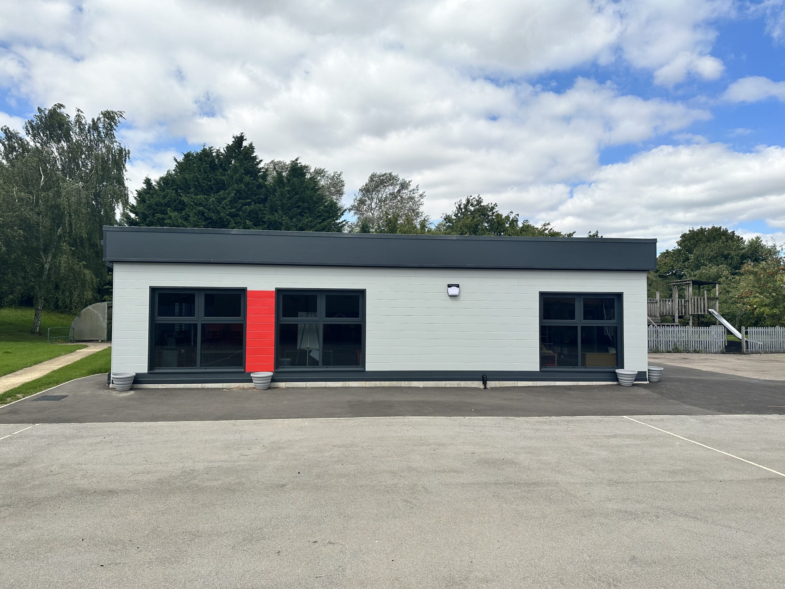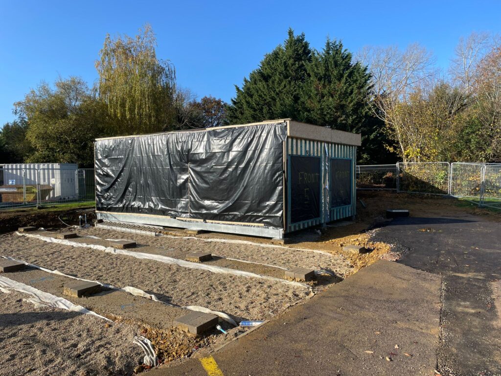 A service trench was also excavated to update the building’s electric mains, data, fire, and water systems, strategically completed during school holidays to minimise disruption. Shanco ensured constant airflow below the modular building by placing 7N blocks on the strip foundations and installed a flag on edge detail around the perimeter, facilitating the construction of tarmac footpaths.