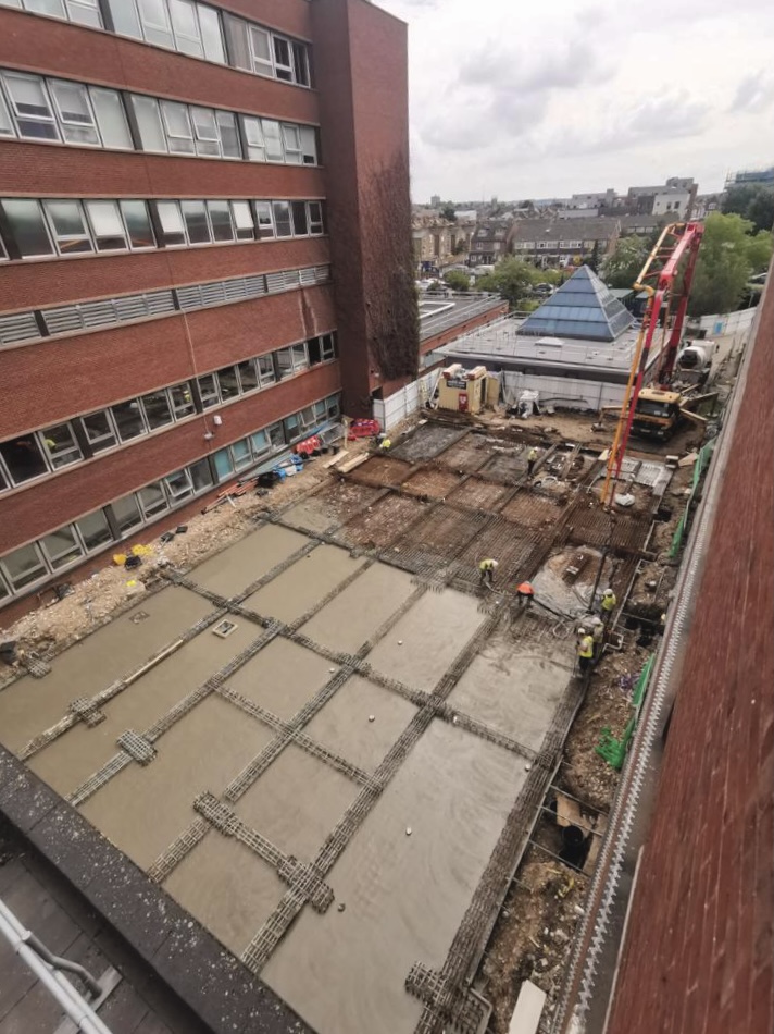 The slab pour demanded precise coordination to position the pump and maintain a continuous flow of wagons, another example of logistics-led delivery on a restricted hospital site.